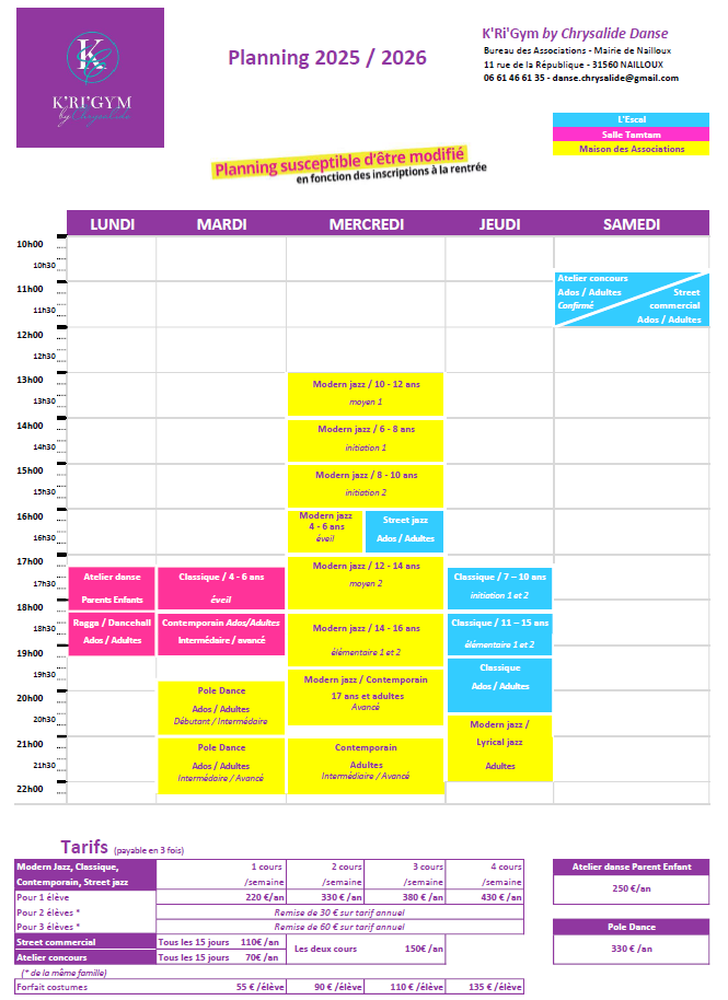 Chrysalide Danse – Planning Planning des cours de danse 2025/2026Cliquez sur le lien pour télécharger le planning en pdf !